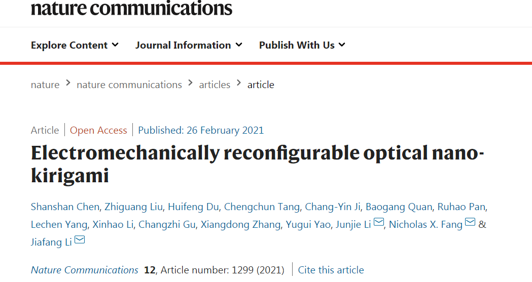 Shanshan Chen#, Zhiguang Liu#, Huifeng Du#, Chengchun Tang#, Chang-Yin Ji, Baogang Quan, Ruhao Pan, Lechen Yang, Xinhao Li, Changzhi Gu, Xiangdong Zhang, Yugui Yao, Junjie Li*, Nicholas X. Fang*, and Jiafang Li*, “Electromechanically reconfigurable optical nano-kirigami”, Nature Communications 12, 1299 (2021).