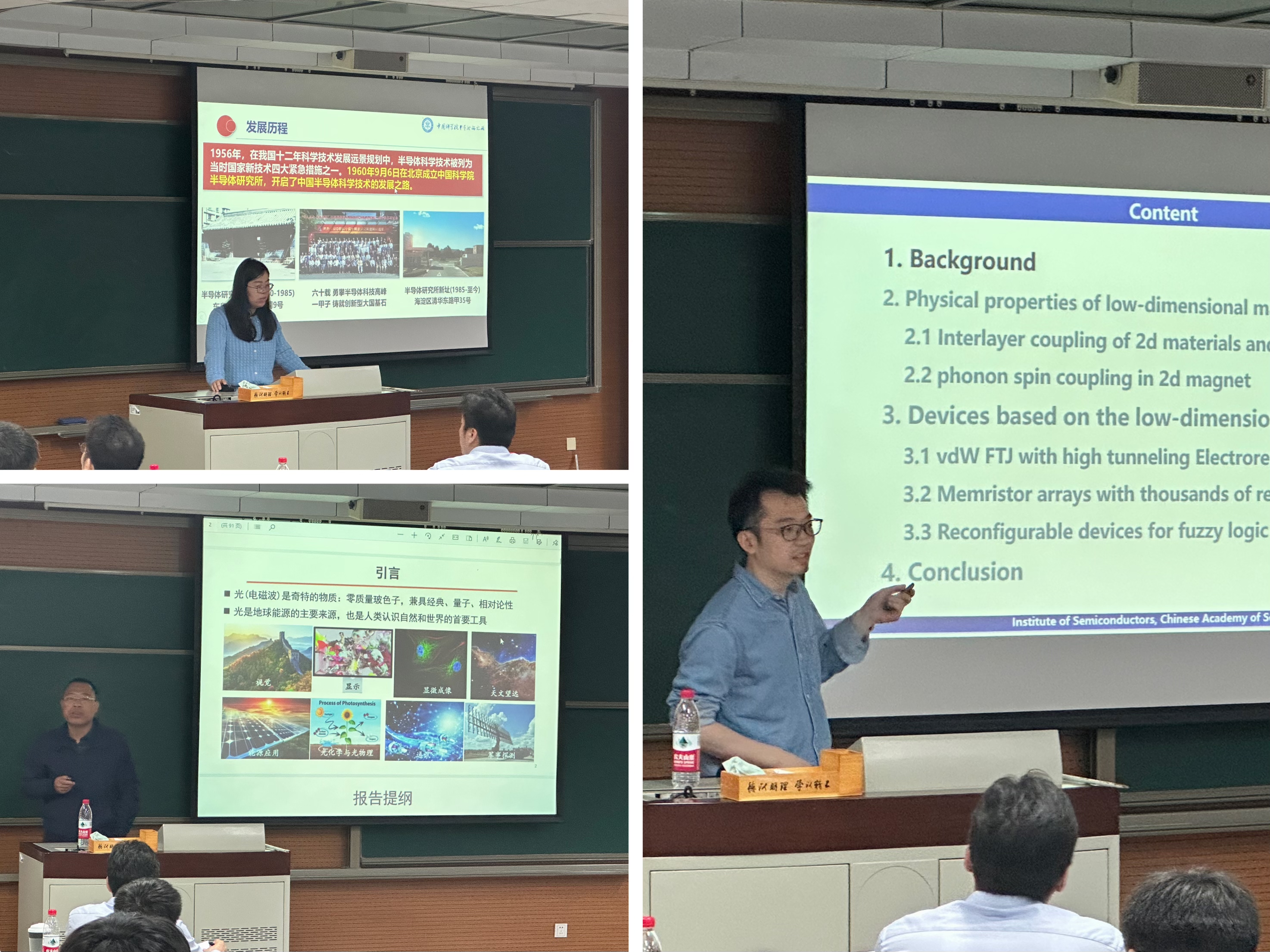 在开班仪式上,半导体所张菁研究员还介绍了半导体所对入选黄昆班同学的具体教学安排。最后,半导体所张永亮研究员以“微纳光学漫谈—从基础到前沿”为题给同学们做了精彩的报告;吴江滨研究员以“低维材料物性与新机理器件”为题,给同学们分享了几类面向新型计算构架的高性能电子器件等前沿进展。会后,老师们给同学们进行详尽的答疑解惑。